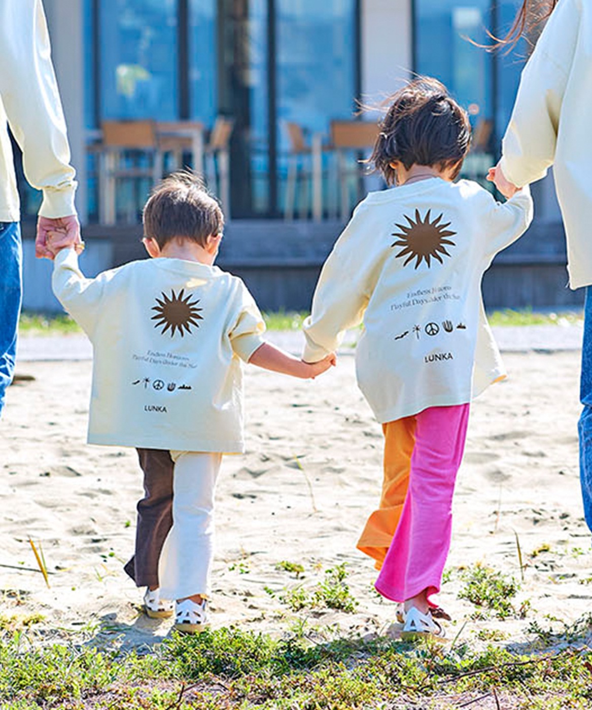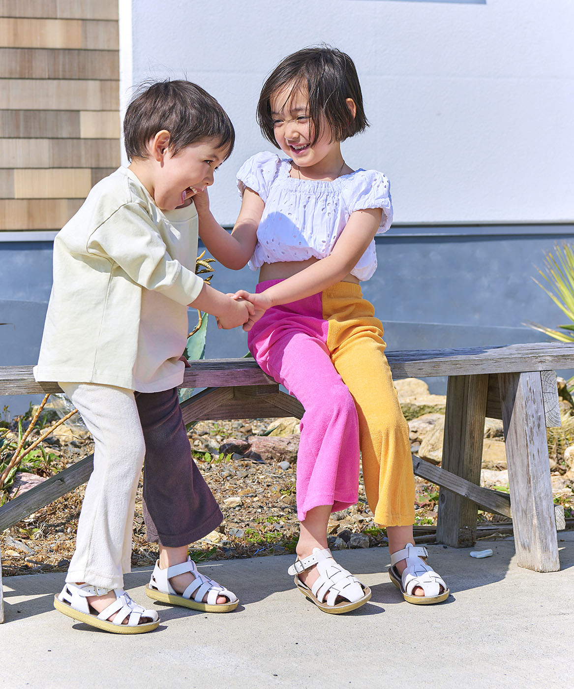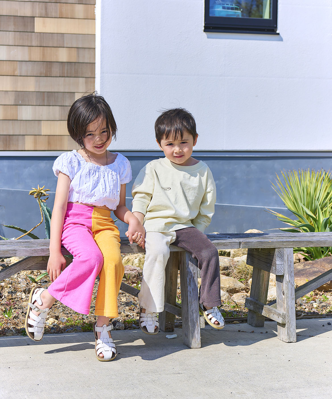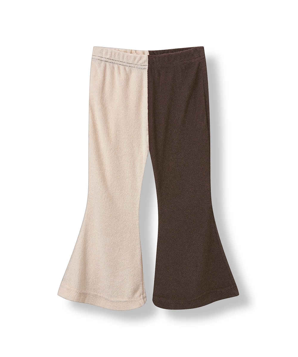 目を惹くバイカラーの配色が楽しい、フレアシルエットのテリーパンツ。左右で異なる色合いが、子どもたちの自由な感性にぴったりマッチ。動きやすくてお手入れも簡単なテリー素材だから、たくさん遊んで、たくさん笑って、たくさん着てほしい。ナチュラルなカジュアルスタイルにひとさじのスパイスを。