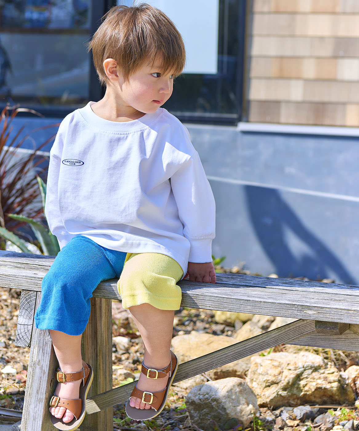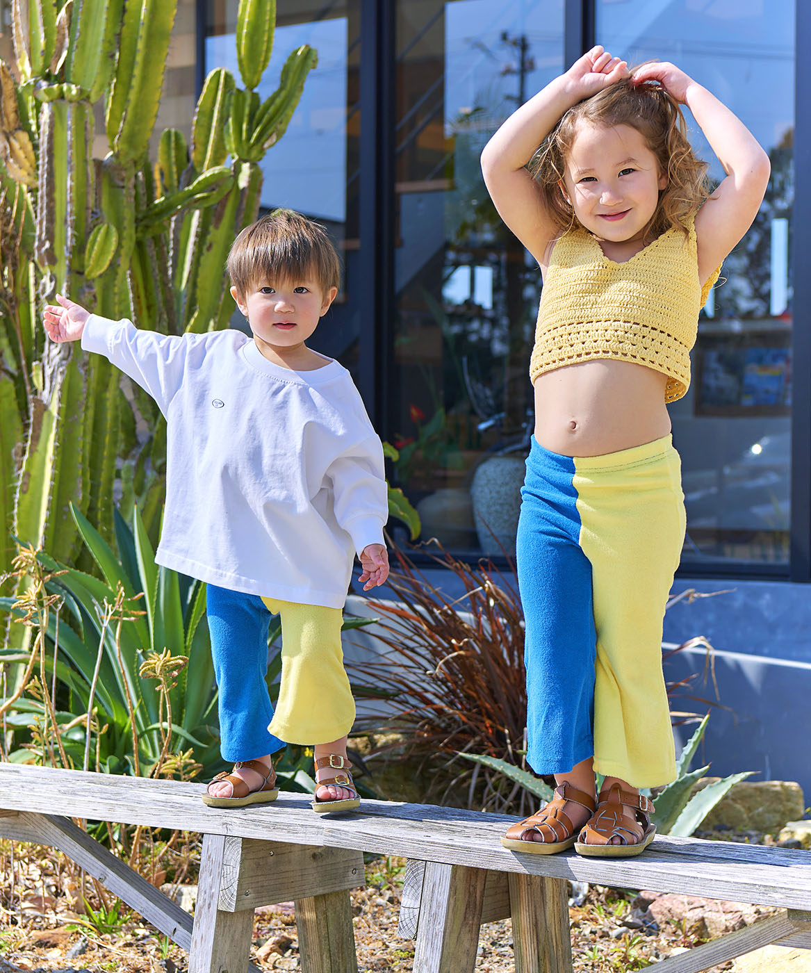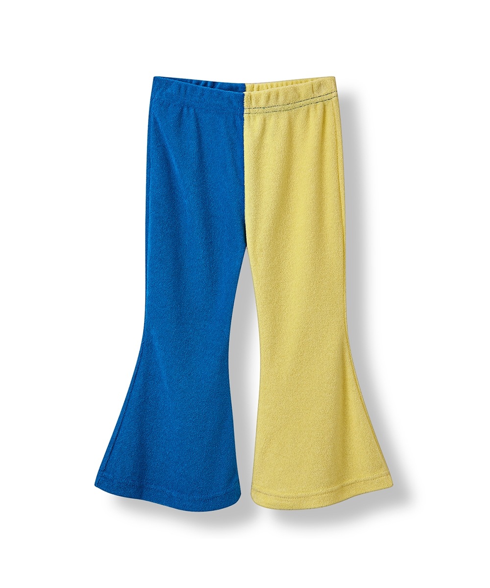 目を惹くバイカラーの配色が楽しい、フレアシルエットのテリーパンツ。左右で異なる色合いが、子どもたちの自由な感性にぴったりマッチ。動きやすくてお手入れも簡単なテリー素材だから、たくさん遊んで、たくさん笑って、たくさん着てほしい。ナチュラルなカジュアルスタイルにひとさじのスパイスを。