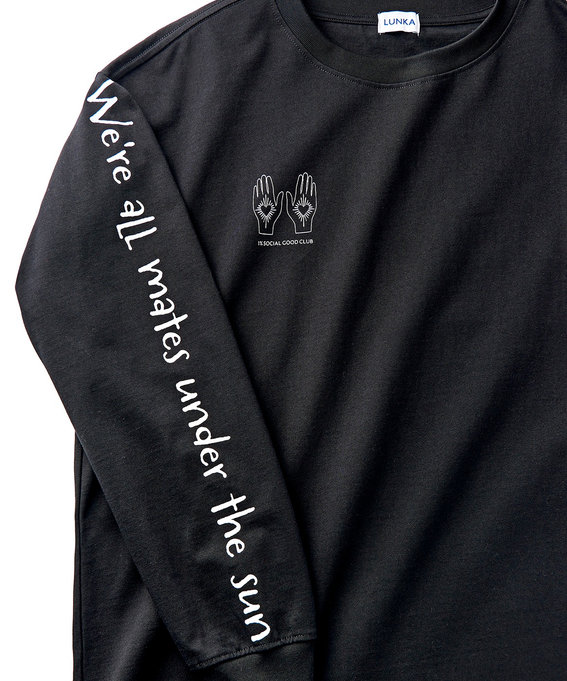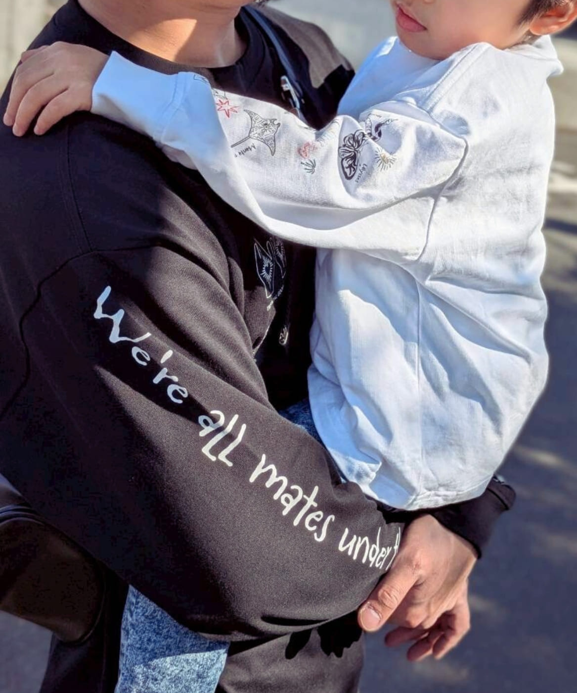 反対の袖に刻んだのは、<We're all mates under the sun> というメッセージ。